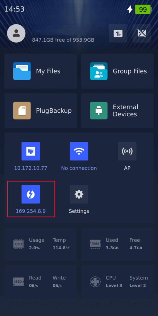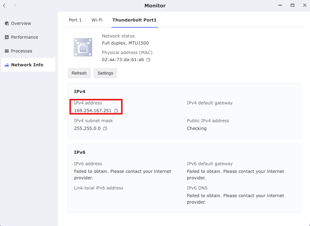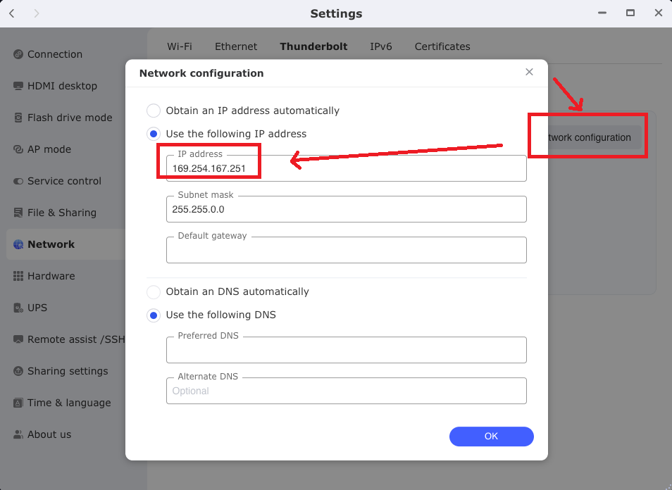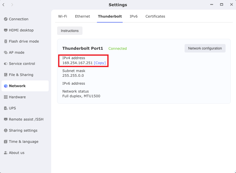 If your computer shows an IP starting with 169.254.xxx.xxx, it has automatically switched to Thunderbolt network mode. If needed, set a manual IP address that does not conflict with other devices on your network.