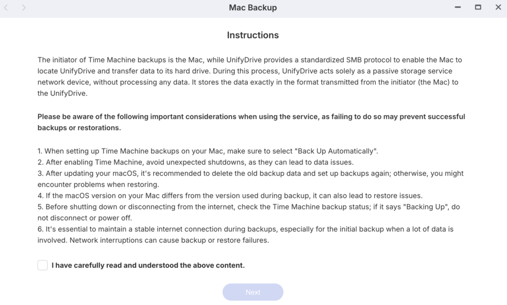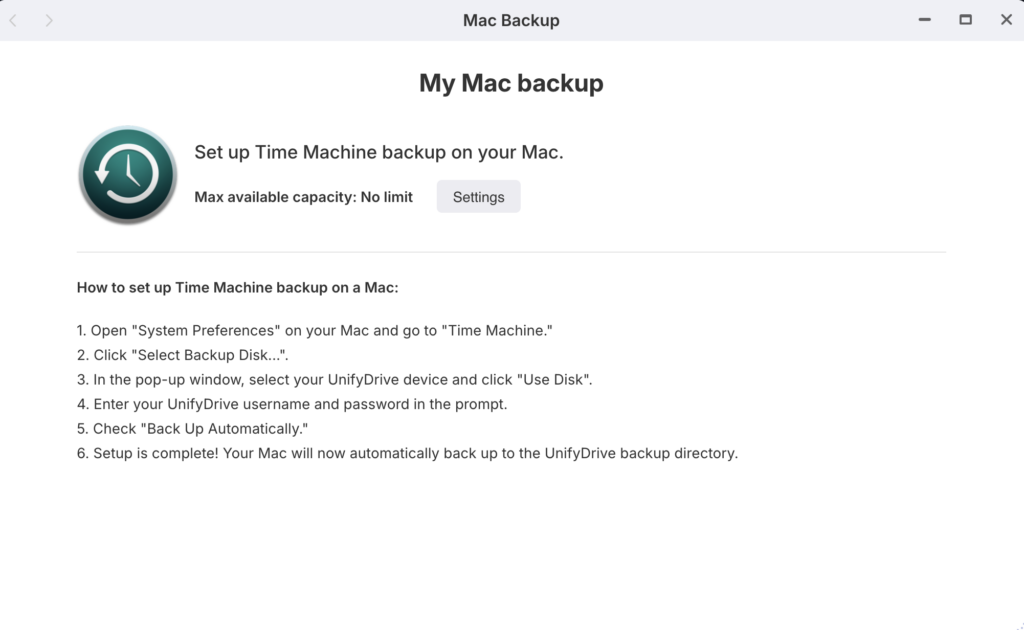 2. Multi-Device Management If you are backing up multiple Mac devices (e.g., both a MacBook and a Mac mini) to a single UnifyDrive account, the storage pool will be shared. Please ensure the allocated capacity is sufficient to accommodate the version history for all connected devices.