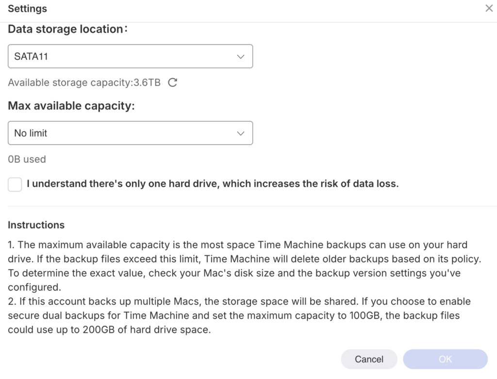 1. Storage Allocation & Retention Policy The “Max available capacity” defines the storage ceiling for your Time Machine data. For professional users with large internal drives (such as those on Mac desktops), we recommend setting this limit to 2-3 times your Mac’s used disk space. Once this limit is reached, Time Machine will automatically rotate and delete the oldest backup snapshots to make room for new data.